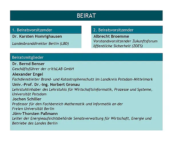 Der KKI e. V. wird in seiner Arbeit von einem unabhängigen Beirat unterstützt. Dieser setzt sich aus führenden Vertretern aus Politik, Verwaltung, Wissenschaft sowie Organisationen der Gefahrenprävention und -bekämpfung zusammen.